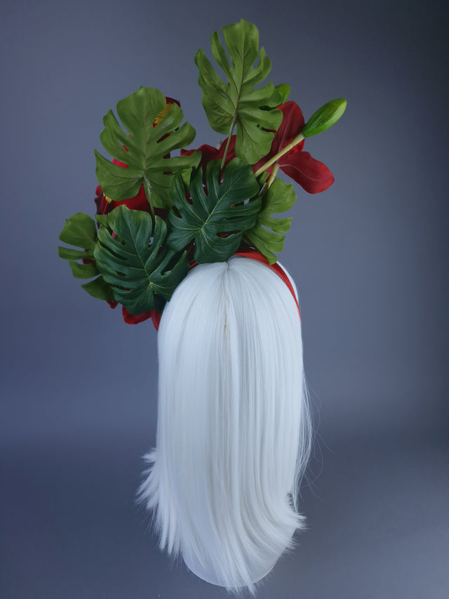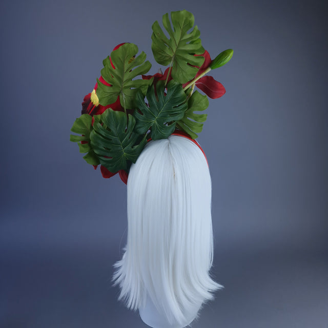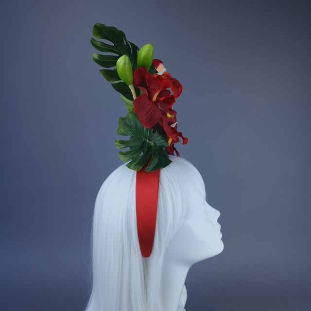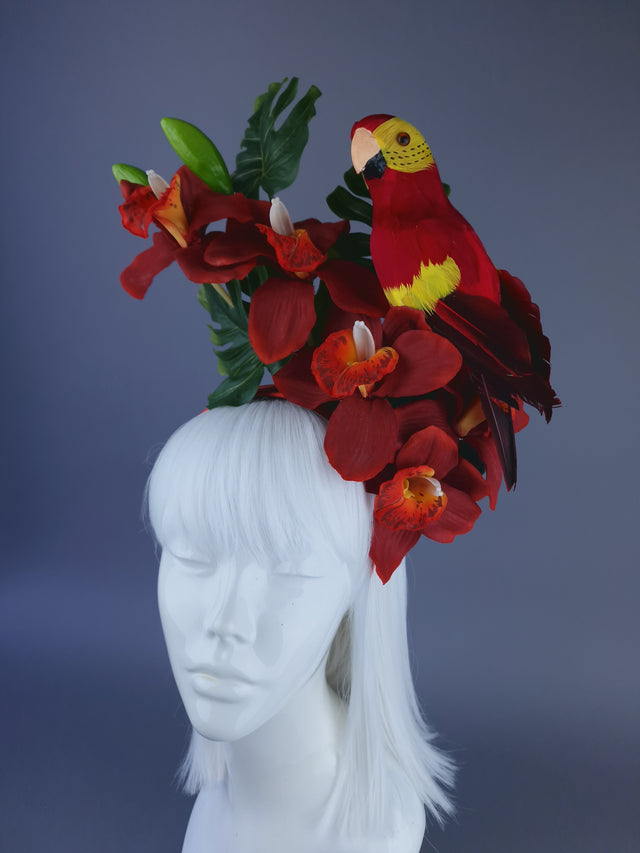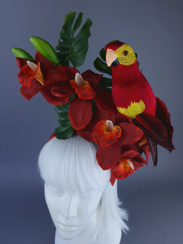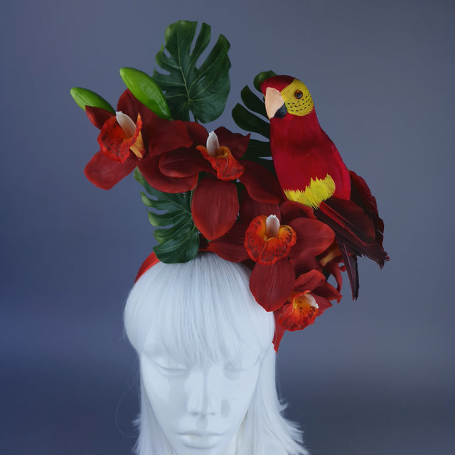 Vivid red Orchid flower headpiece, decorated with mini monstera leaves and a feathered red parrot, search sassily on the side.