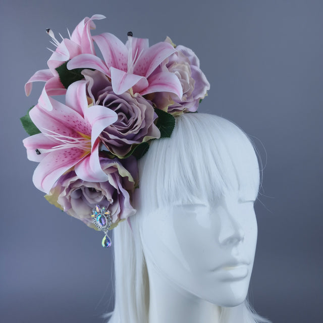 Pink & Purple rose & lily flower headpiece, back with leaves.