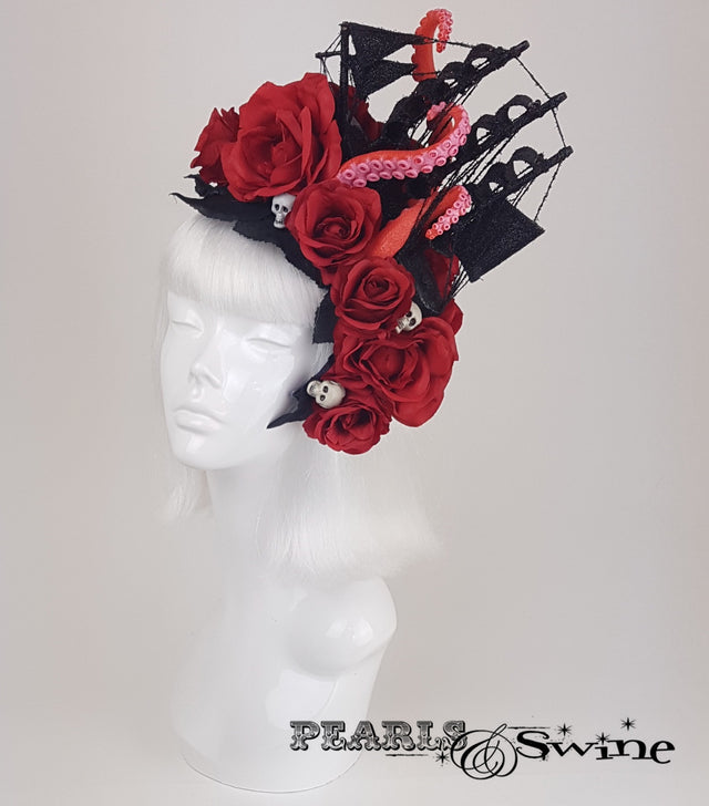Black glittered ship on a sea of red roses and black leaves, being attacked by a giant octopus's tentacles, sprinkled in a few skulls. This is a piece of wearable art! Set on a wired curved sinamay base backed with leopard print satin. Attaches with a comb and hat elastic. Bobby pins will secure this creation further if required.
