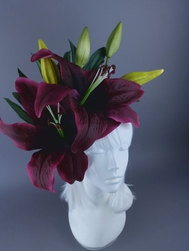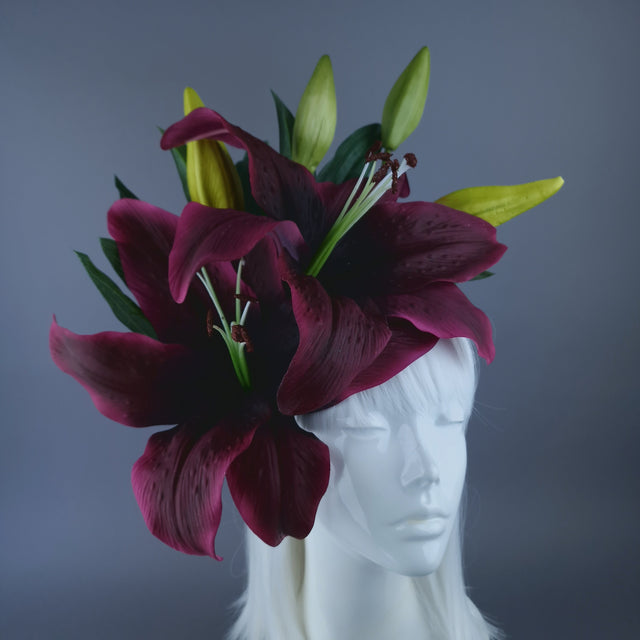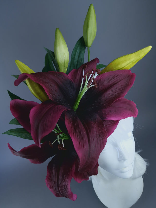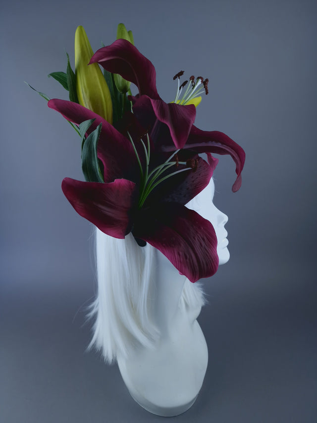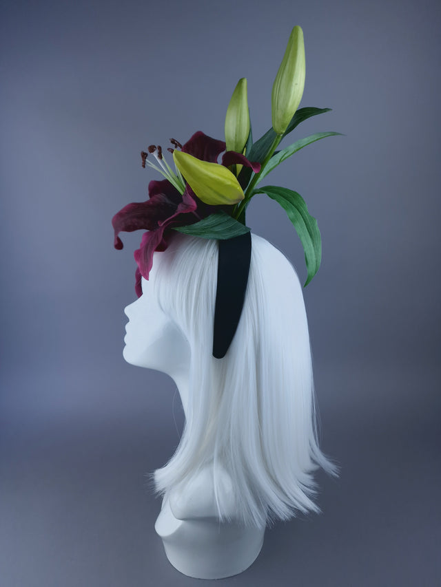 Statement massive lily & leaf headpiece set on wide satin headband.This attaches with a headband & combs