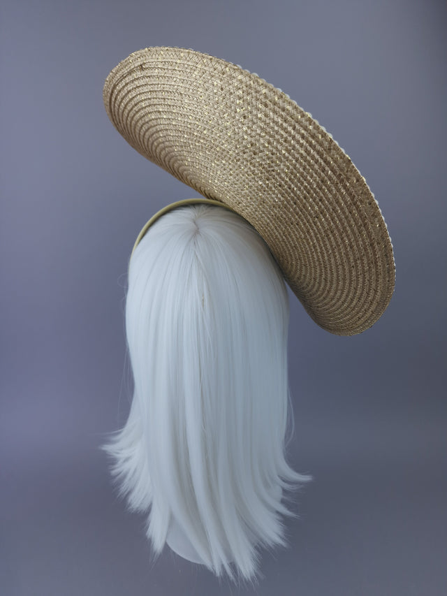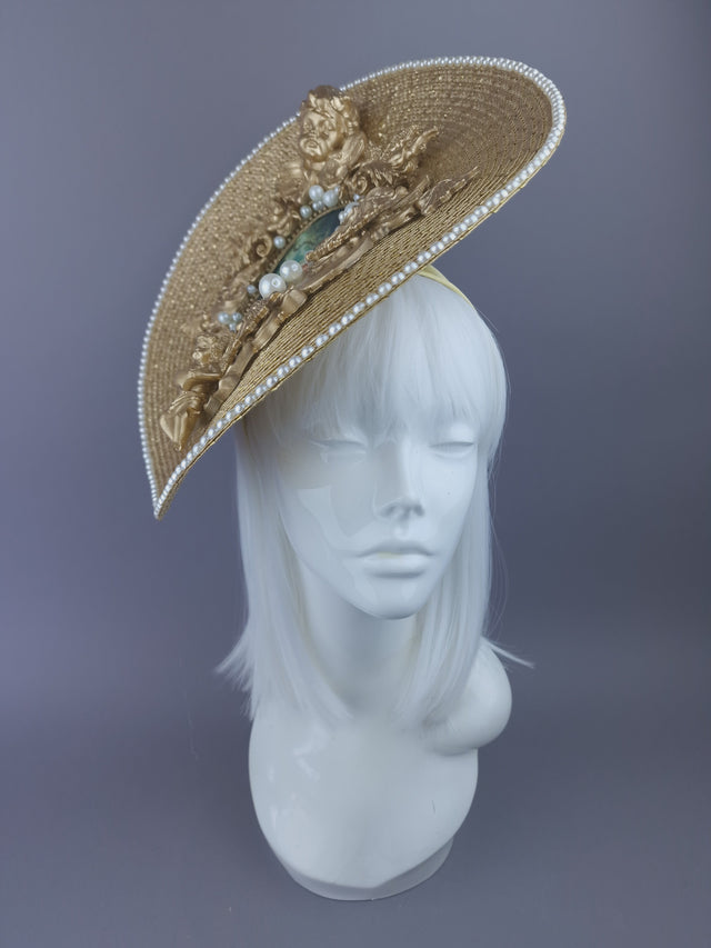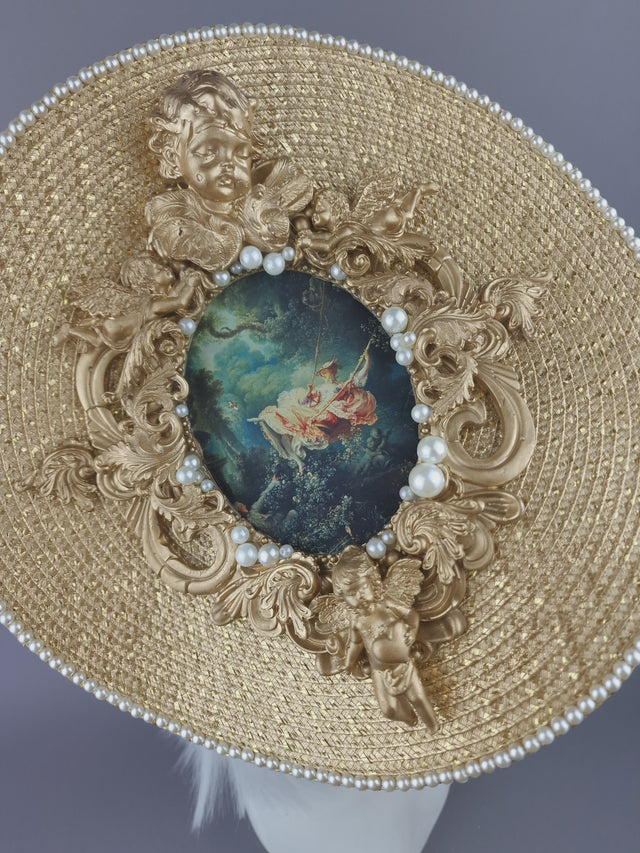 Rococo art print by Jean-Honore, in a filigree & pearl gold frameset on a gold hat base. A real statement headpiece!